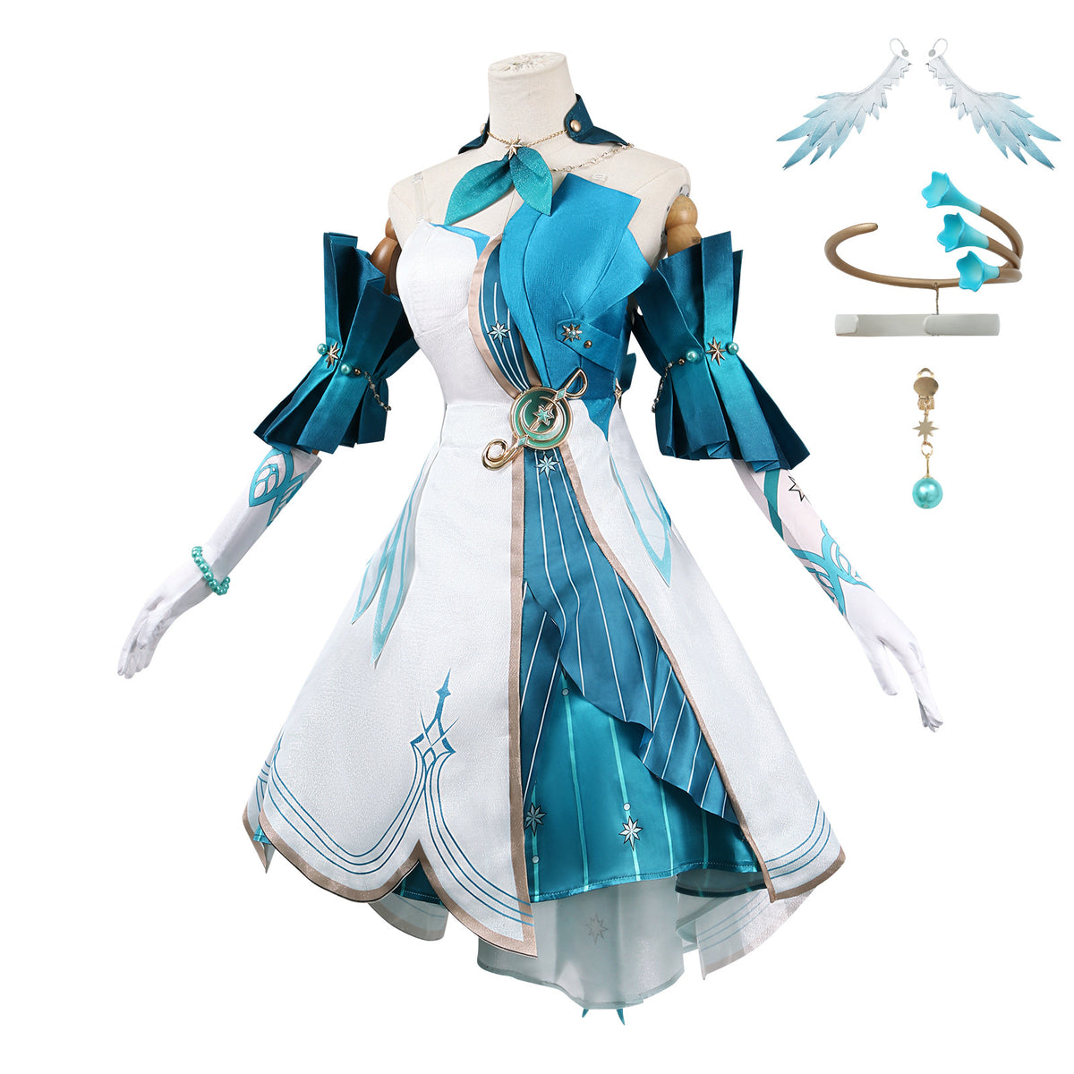 Included Items: Dress / Necklace / Gloves / Sleeves / Waist accessory / Earrings x3 / Bracelet / Shoulder straps / Headwear. The wig is not included in the fullset.