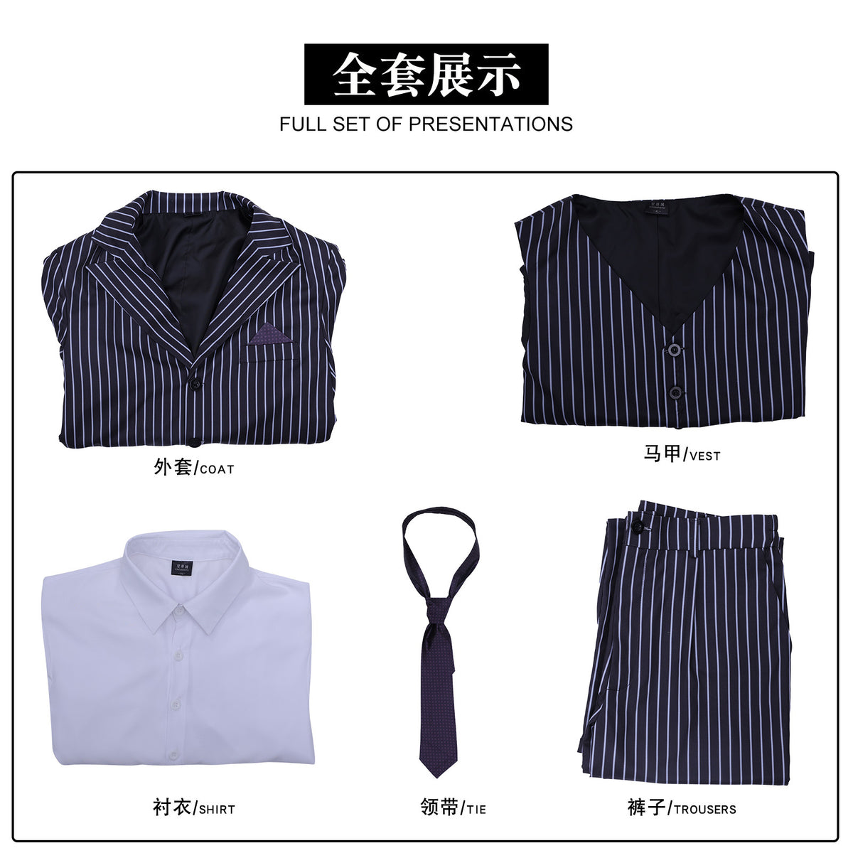 Included Items: Coat / Vest / Shirt / Pants /Tie
