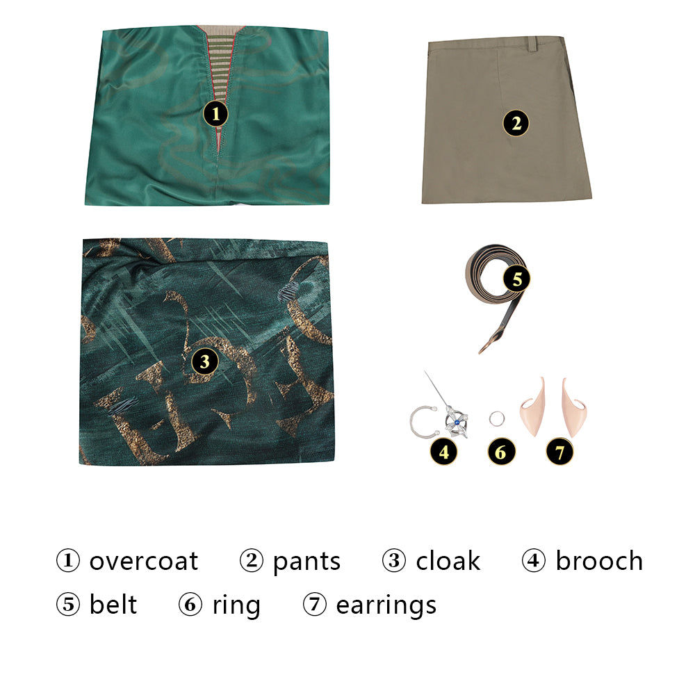 Included Items: overcoat, pants, cloak, brooch, belt, ring, earrings