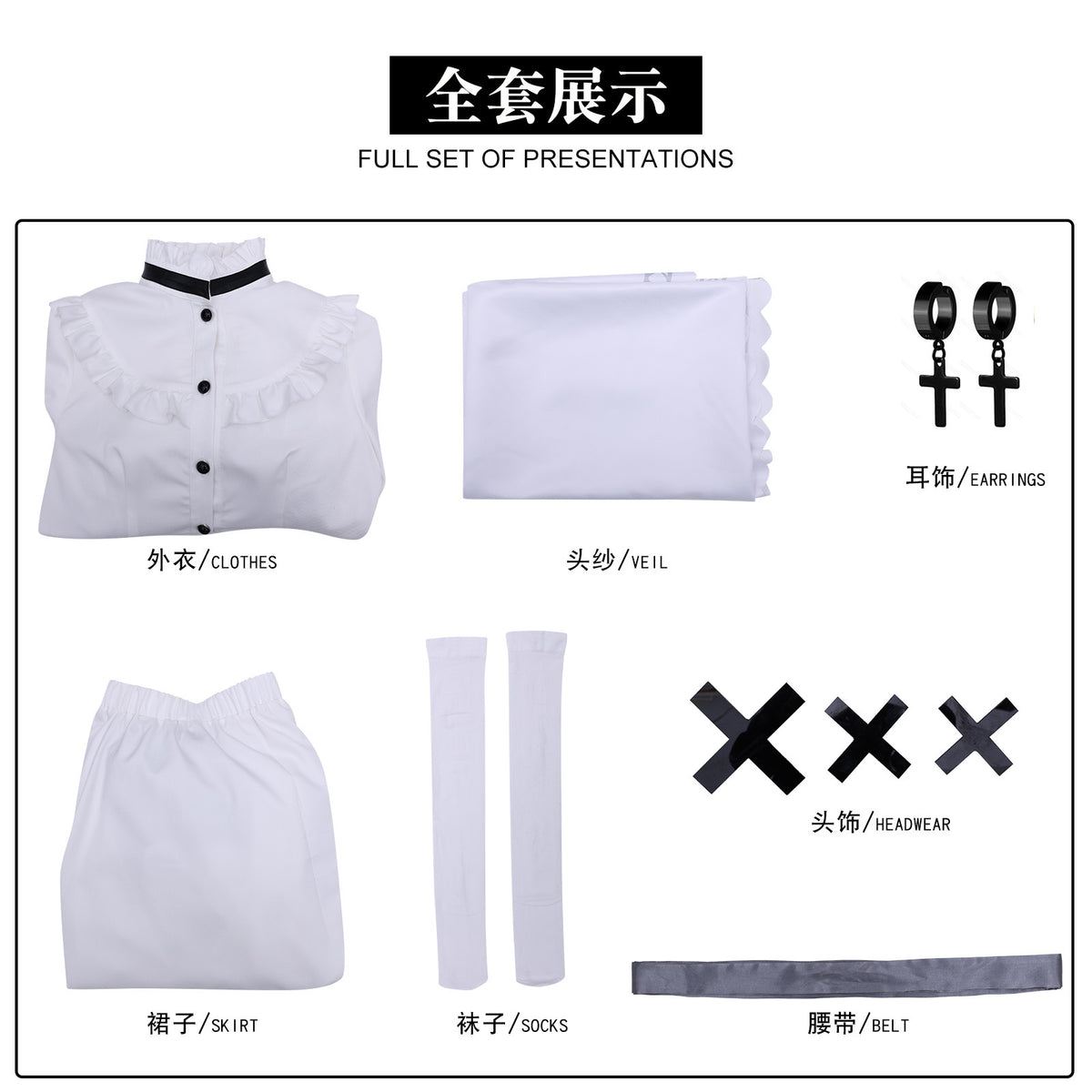 Included Items: Shirt / Skirt / Headwear / Veil / Earrings / Socks / Belt